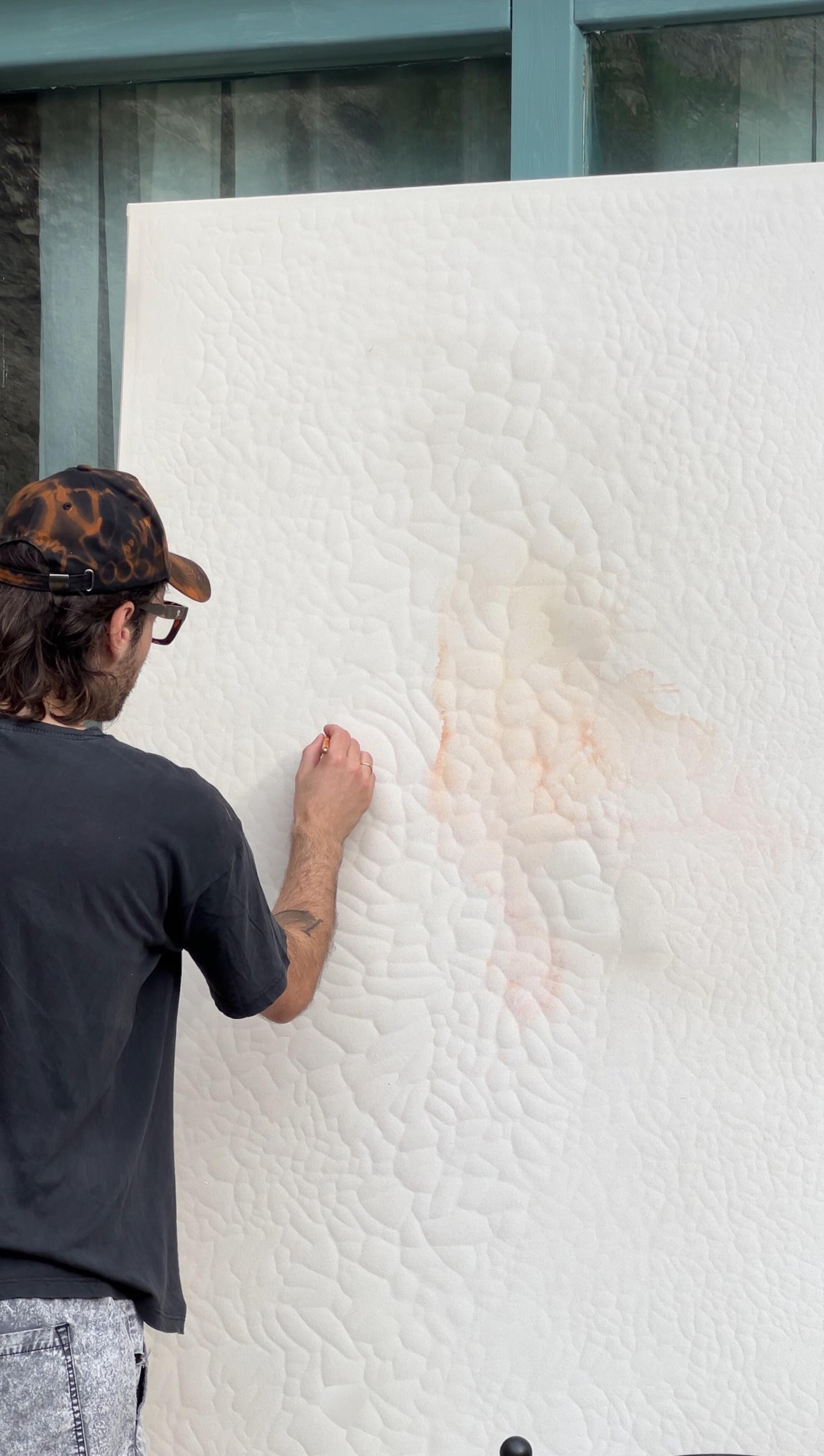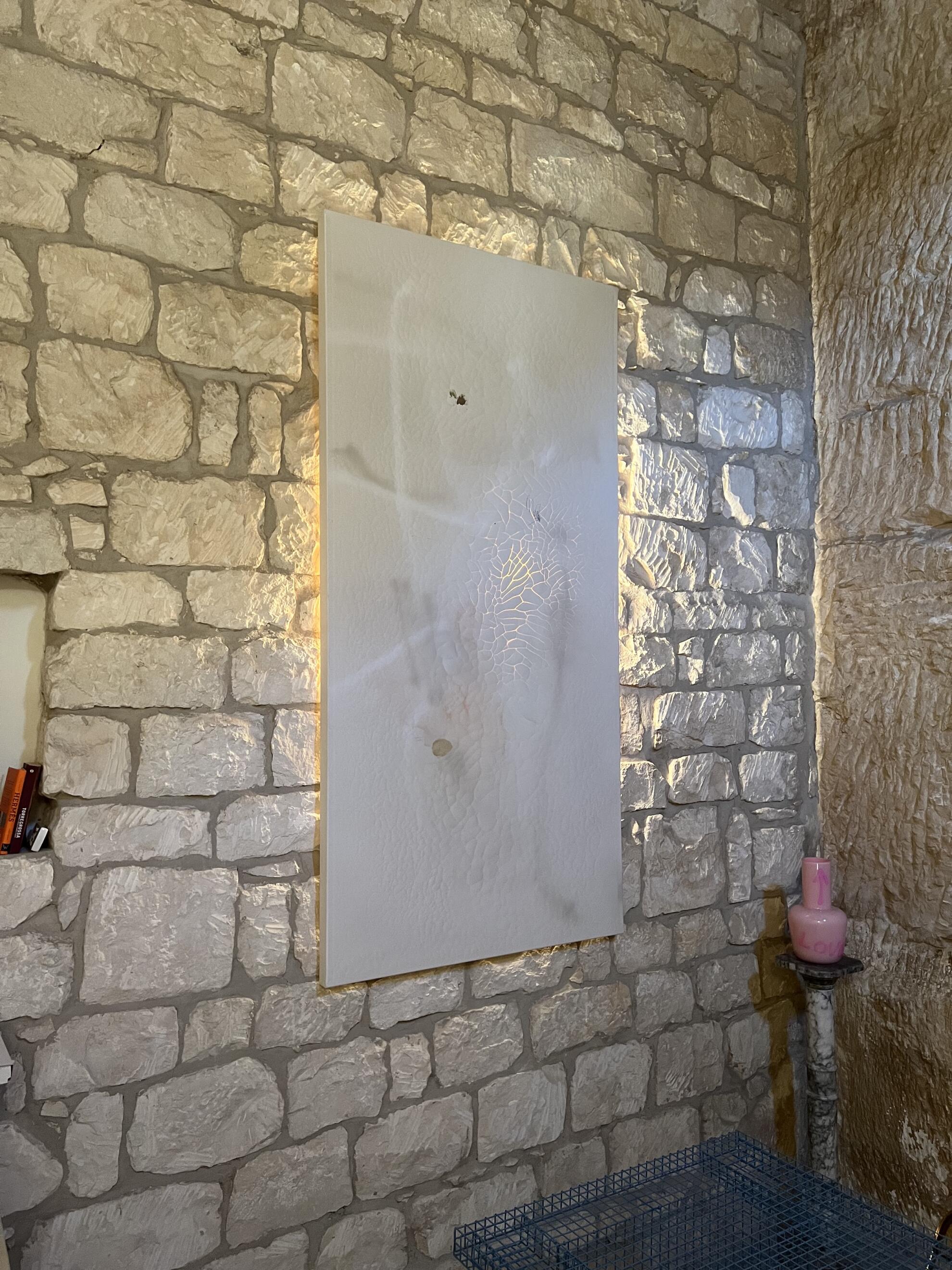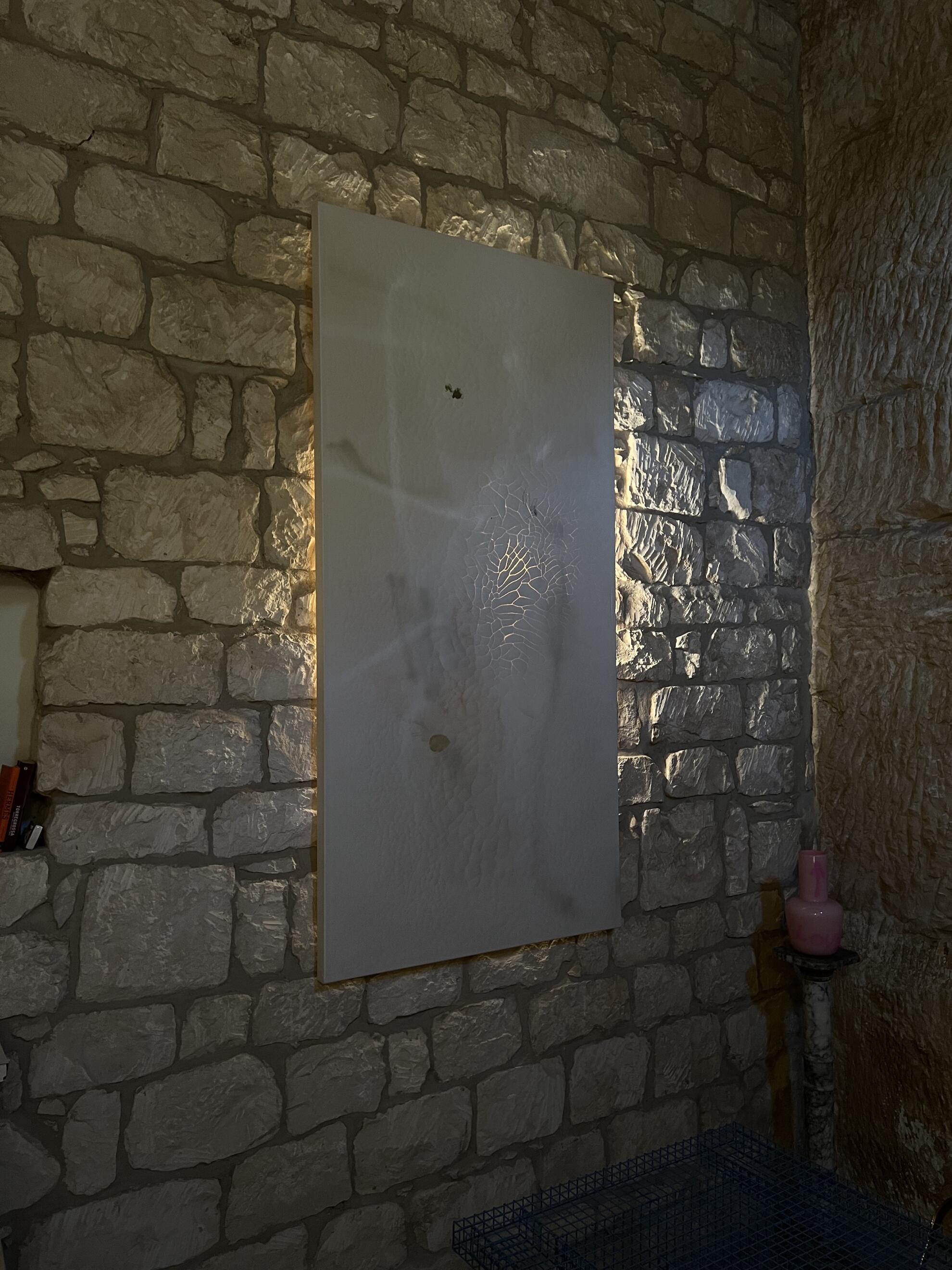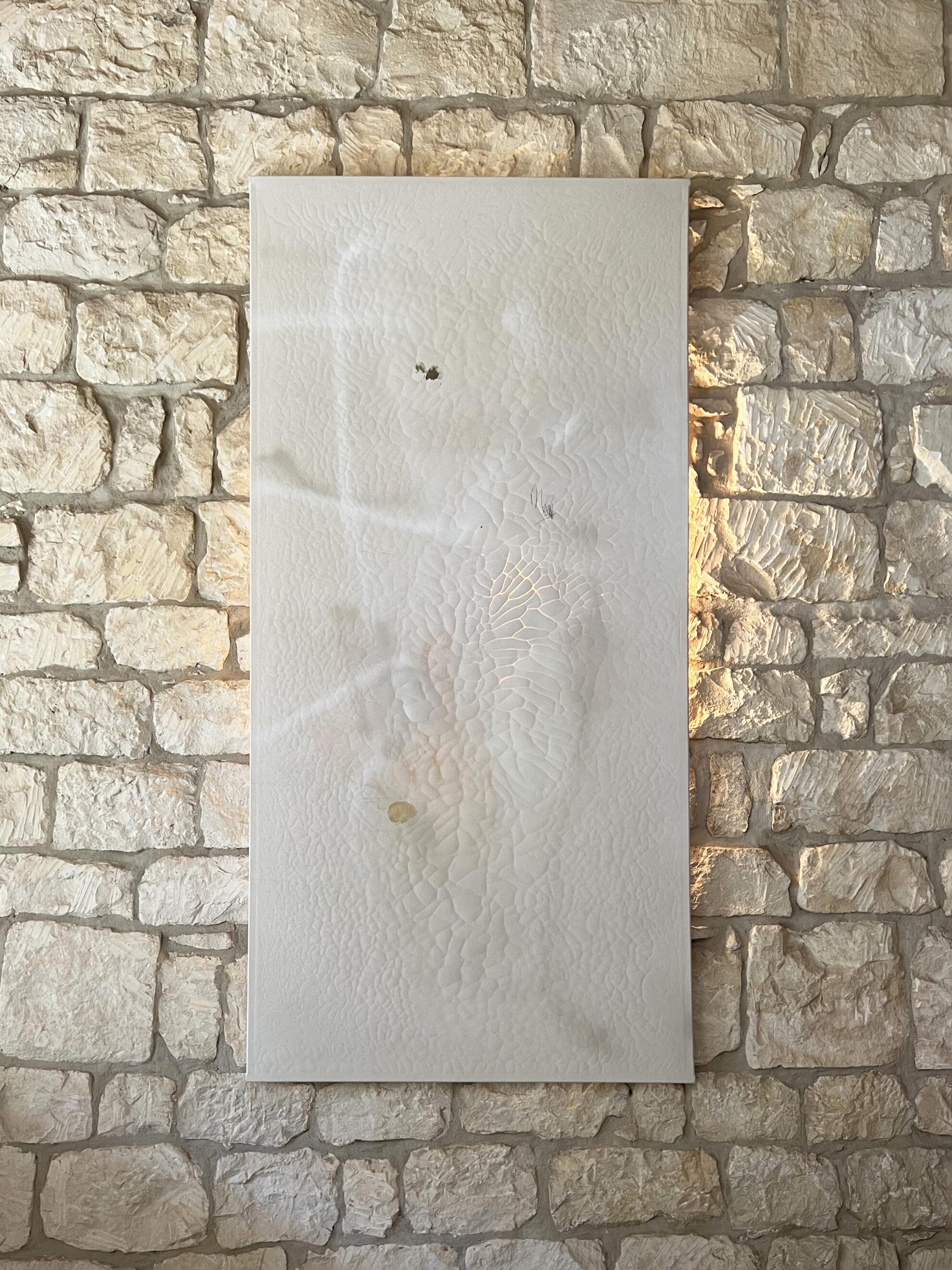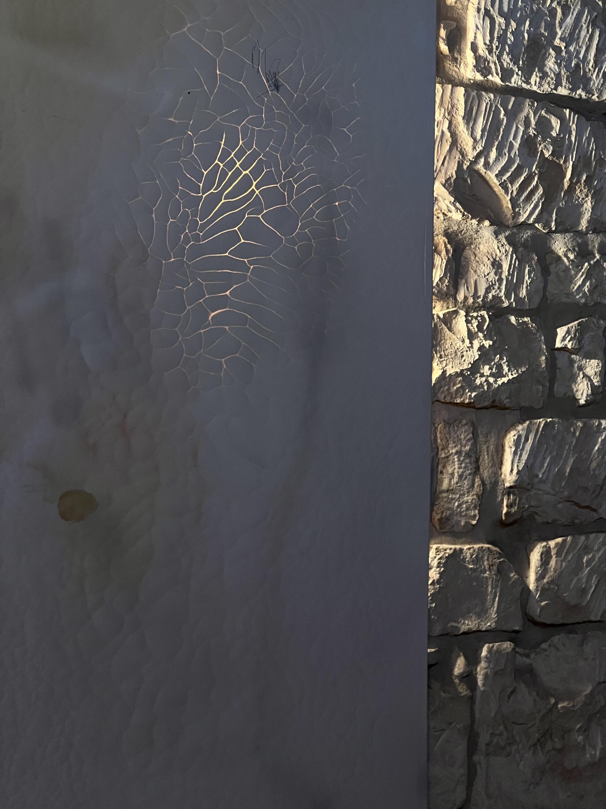 "I wanted to try to create something specifically for this space. Something that would work with the interior in terms of composition and color, complementing it while also serving as ambient lighting and a variable element that, thanks to its plasticity, reacts to the light in the space, similar to the rock present everywhere around Casa Blanca, which also looks different depending on the time of day and where we look at it from. This has resulted in dozens of different variations of the same image. The play of light, shadows, and the placement of the work in space is exactly what I have been most interested in and enjoy exploring lately."